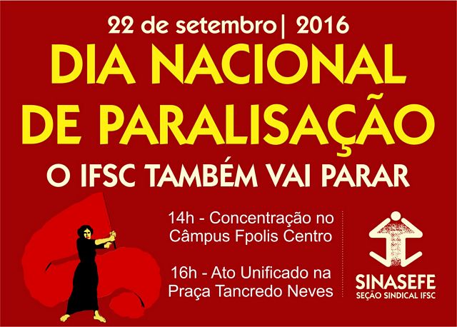 Em Florianópolis, haverá um Ato Unificado, com concentração a partir das 16h, na Praça Tancredo Neves, em frente à Assembleia Legislativa. O Sinasefe orienta todos os câmpus a organizar caravanas para a participação nessa atividade na capital. As informações detalhadas podem ser obtidas junto aos representantes do sindicato em cada local.