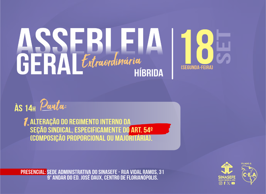 O processo de alteração do regimento da Seção IFSC do Sinasefe, iniciado na assembleia de ontem (12/9), só será finalizado no próximo dia 18/9, em nova assembleia que será realizada de forma híbrida, também na Sede Administrativa do Sindicato, no centro de Florianópolis, a partir das 14h. A convocação oficial você confere aqui.