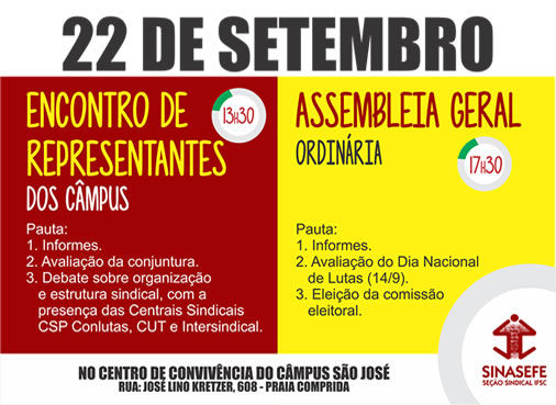 No mesmo dia e local, às 17h30min, acontece assembleia ordinária da Seção, que vai fazer uma avaliação do Dia Nacional de Lutas, ocorrido na última quinta (14/9), e eleger os membros da Comissão Eleitoral do Sinasefe, visando às eleições para a escolha da nova diretoria do sindicato, gestão 2017/2019.