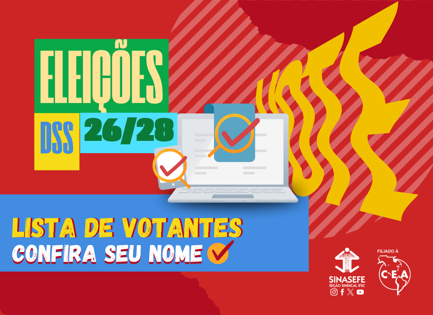 Para as eleições da DSS, serão considerados quites com suas obrigações estatutárias os/as eleitores/as filiados/as até o dia 06/02/26 e que não estejam inadimplentes com a tesouraria do sindicato.