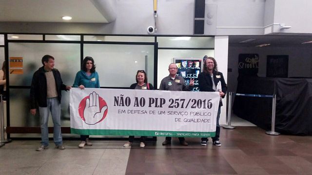 Representantes de sindicatos de servidores públicos de Santa Catarina realizaram hoje (01/08) pela manhã, no aeroporto Hercílio Luz, em Florianópolis, uma panfletagem junto aos parlamentares e à população em geral, com o objetivo de pressionar a bancada catarinense a votar contra o PLP 257/2016, cuja votação na Câmara dos Deputados está prevista para ocorrer esta semana. Sintufsc, Sinasefe, Sintespe e CUT/SC marcaram presença na mobilização.