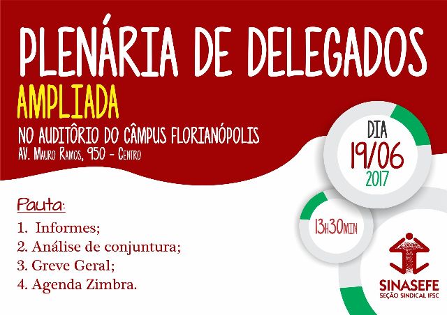 A deliberação das Centrais levou a Seção Sindical do Sinasefe a chamar uma Plenária de Delegados Ampliada, a fim de mobilizar a categoria em todos os câmpus para a organização da greve no âmbito do IFSC. A Plenária vai acontecer no próximo dia 19 de junho, uma segunda-feira, a partir das 13h30min, no auditório do Câmpus Florianópolis – Centro. Além dos informes, da análise de conjuntura e da greve geral, a Plenária vai debater também a luta contra a agenda Zimbra.
