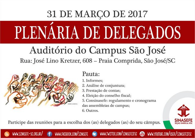 A Seção Sindical IFSC vai realizar no dia 31 de março (sexta-feira), a partir das 13h30min, no auditório do Câmpus São José, a sua primeira Plenária de Delegados do ano de 2017. Além dos informes e da análise de conjuntura, a pauta prevê também a prestação de contas do Sindicato, a eleição do Conselho Fiscal e o 31º Consinasefe, que será realizado em Salvador/BA, no período de 18 a 21 de maio.