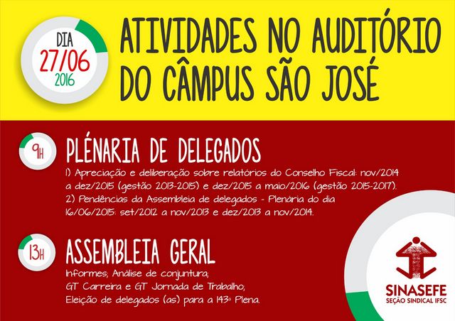 A Seção Sindical IFSC do Sinasefe vai realizar na próxima segunda-feira, dia 27 de junho, uma Assembleia de Delegados – Plenária para prestação de contas das gestões 2013/2015 e 2015/2017. A Plenária vai acontecer a partir das 9h, no auditório do câmpus São José. Logo depois do almoço, às 13h, no mesmo local, acontece a assembleia geral extraordinária, com a pauta voltada para análise de conjuntura, GT Carreira e Jornada de Trabalho e eleição de delegados à 143ª Plena, que será realizada nos dias 2 e 3 de julho, em Brasília.