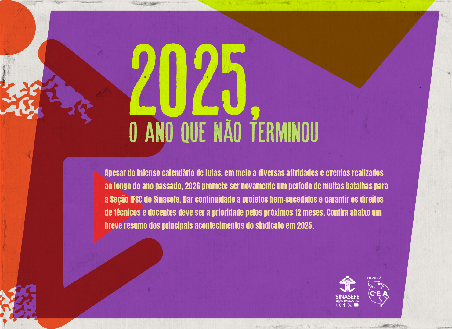 A Seção Sindical IFSC do Sinasefe apresenta a seguir uma retrospectiva das principais lutas, eventos e atividades realizadas ao longo do ano passado. O material, intitulado “2025, o ano que não terminou”, reúne os principais fatos políticos, organizativos e jurídicos que marcaram a atuação do sindicato nesses últimos 12 meses.