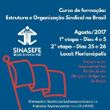 A Seção Sindical IFSC do Sinasefe vai realizar, no mês de agosto, em Florianópolis, o curso de formação “Estrutura e Organização Sindical no Brasil”. Ministrado pelo Instituto Latinoamericano de Estudos Socioeconômicos (ILAESE), o curso vai acontecer em duas etapas, nos dias 4 e 5/08 e nos dias 25 e 26/08. O público-alvo é formado por representantes de base, com duas vagas por Câmpus, e dirigentes da Seção. As inscrições encerram no dia 1º de agosto.