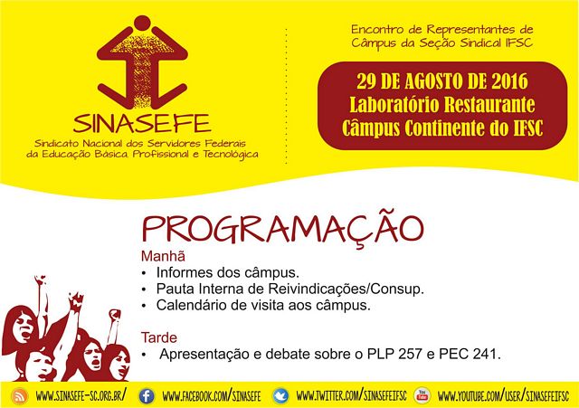 A Seção Sindical IFSC do Sinasefe vai realizar na próxima segunda-feira (29/08), a partir das 9h, no Laboratório Restaurante do Câmpus Continente, em Florianópolis, o seu segundo Encontro de Representantes de Câmpus em 2016.