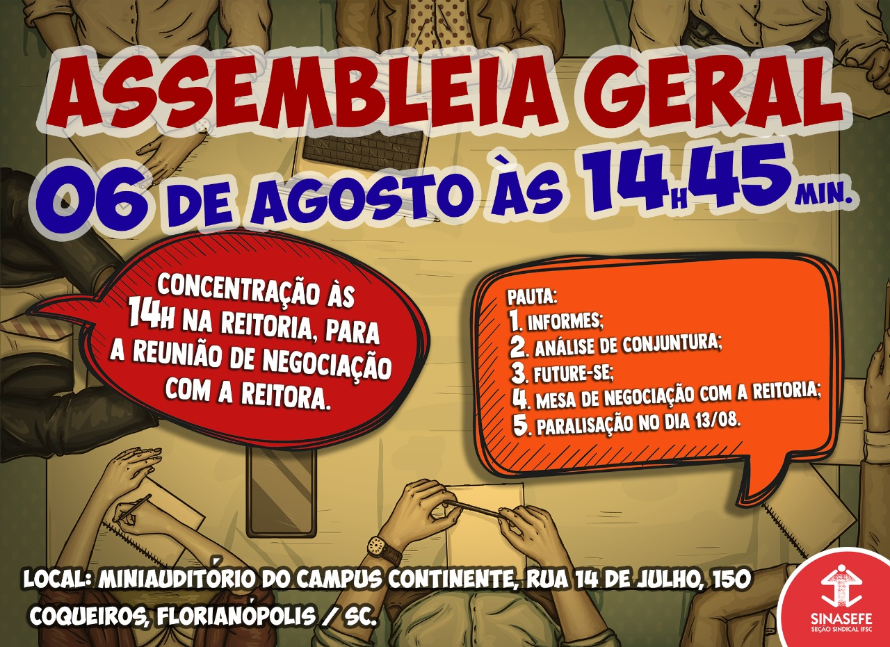 Além de discutir e deliberar sobre os encaminhamentos relativos ao corte do ponto, a assembleia vai debater ainda a conjuntura, o projeto “Future-se” e a paralisação do próximo dia 13 de agosto, em defesa da educação, por empregos e contra a reforma da previdência.